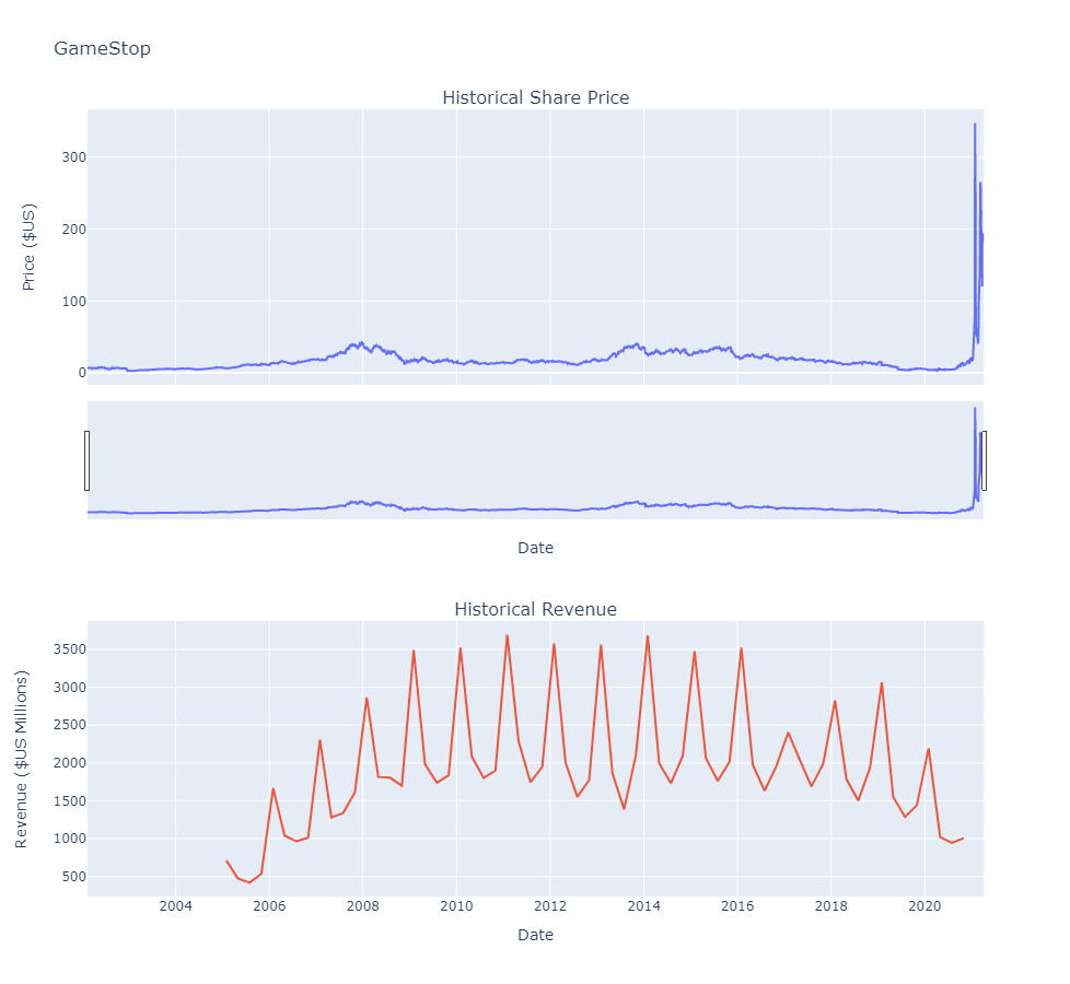 - As we see the results of the two TESLA graphs above(stock graph & revenue graph), it show similar up & down among those two graphs. As Revenue from TESLA starts to rise since 2013, the stock price begins to rise accordingly. But when we see the results of the two GameStop graphs above, we can guess the correlation between the stock price and the revenue has not always been the same as the TESLA's. Even though the Share price of GameStop has soared in 2020, the revenue has been fluctuated since 2005 for now. The GameStop's revenue has arised in the end while there has been many upside-down syndrome until 2009. After 2009, it dramatically fluctuated but in the end it has fallen to about $1000M.