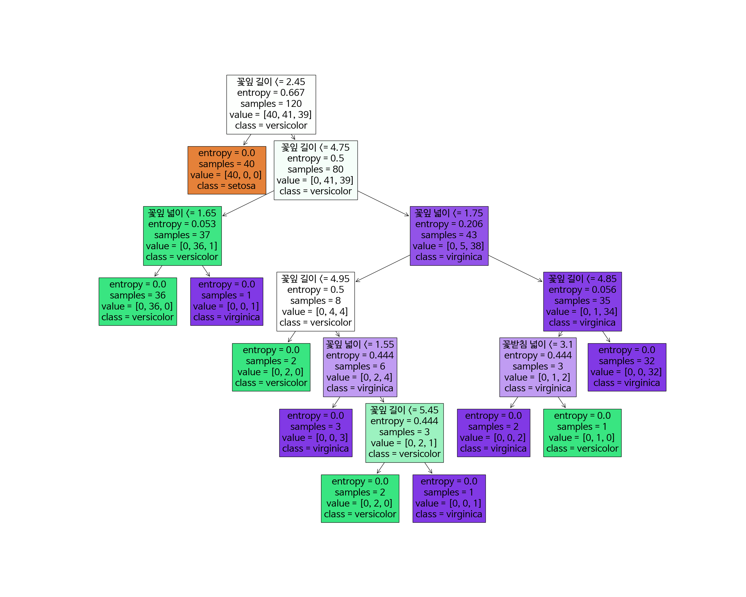 feature_names=['꽃받침 길이','꽃받침 넓이', '꽃잎 길이', '꽃잎 넓이'],