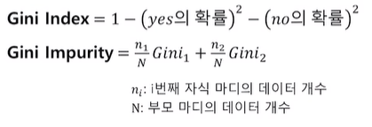 - 즉, 어떤 분류 기준을 가지고 데이터를 나누었을 때 나뉜 각 부류의 지니 계수가 구해짐