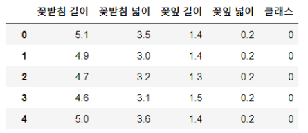 df = pd.DataFrame(X, columns=['꽃받침 길이','꽃받침 넓이', '꽃잎 길이', '꽃잎 넓이'])
