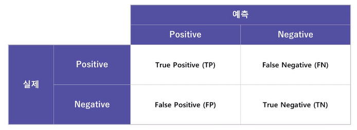 * True Positive: 실제 Positive인 값을 Positive라고 예측 (정답)